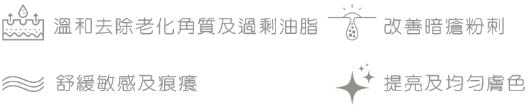 ‣暗瘡粉刺‣毛孔粗大‣膚色暗啞‣膚質粗糙‣敏感痕癢